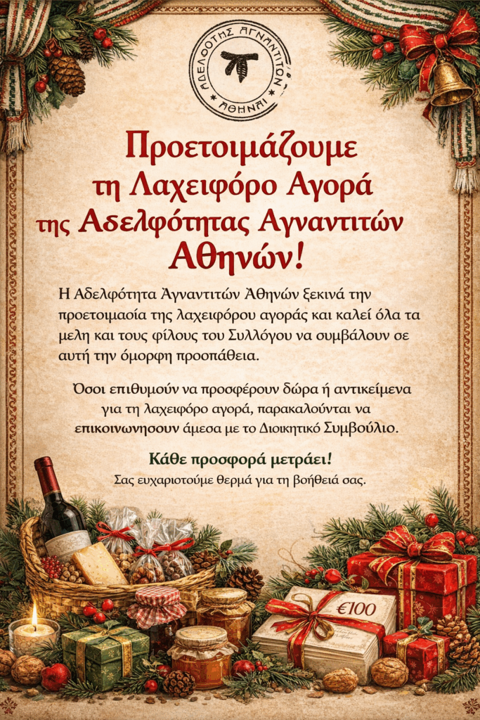 Η Αδελφότητα Αγναντιτών Αθήνας ξεκινά την προετοιμασία της λαχειφόρου αγοράς και καλεί όλα τα μέλη και τους φίλους του Συλλόγου να συμβάλουν σε αυτή την όμορφη προσπάθεια.