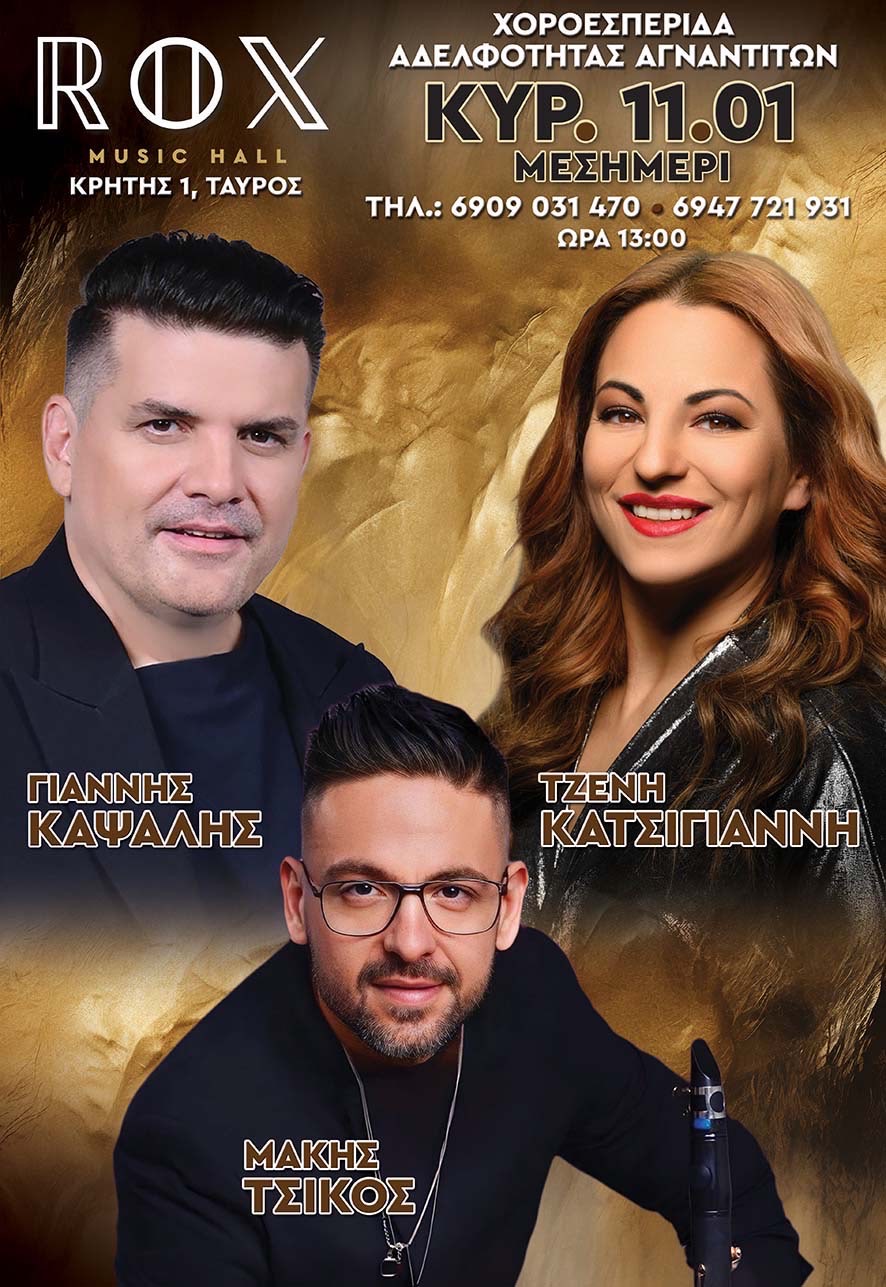 Θα ακολουθήσει πλούσιο μενού φαγητού και διασκέδαση,με τους καταξιωμένους καλλιτέχνες του ROX Music Hall, Γιάννη Καψάλη, Τζένη Κατσίγιαννη και Μάκη Τσίκο !!!