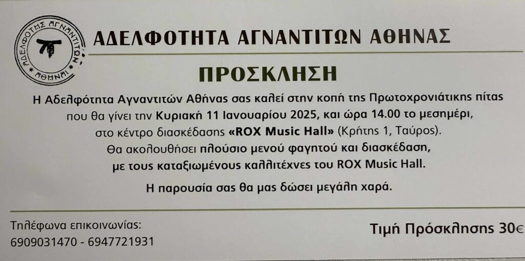 Η Αδελφότητα Αγναντιτών Αθήνας σας καλεί στην κοπή της Πρωτοχρονιάτικης πίτας που θα γίνει την Κυριακή 11 Ιανουαρίου 2025, και ώρα 14.00 το μεσημέρι, στο κέντρο διασκέδασης «ROX Music Hall» (Κρήτης 1, Ταύρος).