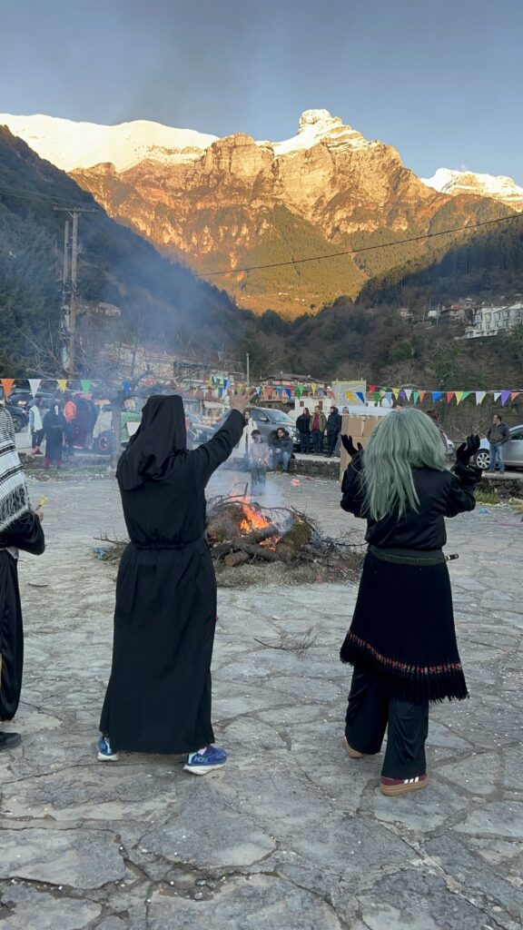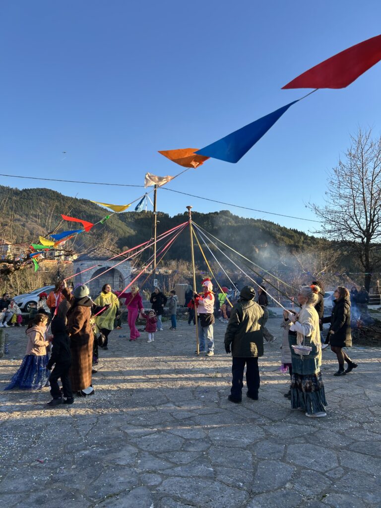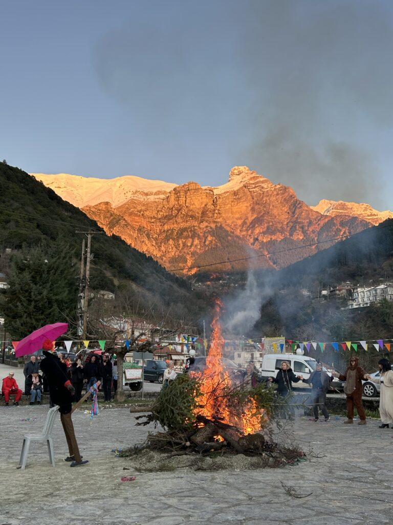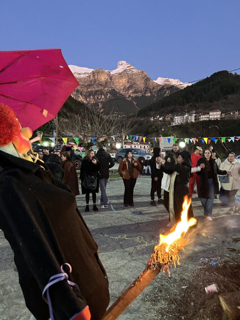 Ακολούθησε το γαϊτανάκι και άλλα παραδοσιακά δρώμενα, ενώ στο μέσον της πλατείας άναψε η μεγάλη φωτιά, με αποκορύφωμα το κάψιμο του βασιλιά Καρνάβαλου. Η πλατεία, με μέριμνα του Συλλόγου, είχε σκεπαστεί προληπτικά για παν ενδεχόμενο. Το γλέντι συνεχίστηκε μέχρι αργά το βράδυ με παραδοσιακή μουσική, χορό, μεζέδες και άφθονο δωρεάν κρασί, σε μια ατμόσφαιρα ζεστή και αυθεντική, όπως μόνο το χωριό μας ξέρει να δημιουργεί.