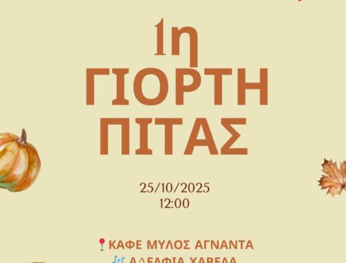 Ο Εκπολιτιστικός Εξωραϊστικός Σύλλογος «Τα Άγναντα» με μεγάλη χαρά ανακοινώνει τη διοργάνωση της 1ης Γιορτής Πίτας, το Σάββατο 25 Οκτωβρίου 2025, στις 12:00 μ.μ., στον φιλόξενο χώρο του Καφέ “Μύλος”. Η γιορτή αυτή έχει στόχο να φέρει κοντά όλους τους…
